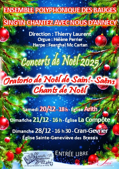 Le programme de ces concerts, en partenariat avec la chorale Sing In d’Annecy, sera essentiellement composé de l’Oratorio de Noël de Camille Saint-Saëns avec, en complément, des chants variés. Comme pour « Les Misérables », une formation de cordes, flûtes, orgue et même harpe sera associée à l’Ensemble Polyphonique.